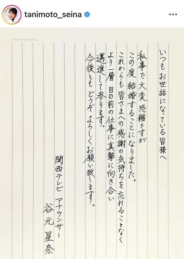 関西人気女性アナ30歳が達筆で結婚報告!松本伊代、磯山さやか、同僚アナも祝福 書道八段の谷元